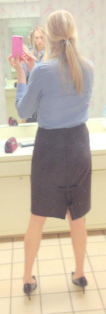 I know you can't tell, but this skirt is actually navy blue with white pencil stripes. When I was a child, I used to dream about the woman I'd be when I wore pencil stripes. I imagined myself in a loft in New York or California (interchangeable in my childhood daydreams as "Places I Have Never Been To") with a much cooler job than I could ever qualify for in real life. I also looked a lot like Christy Wills from The Secret of My Success in those daydreams, all big glasses and fluffy hair. So you didn't always know what you were talking about, Brittany From 1990.