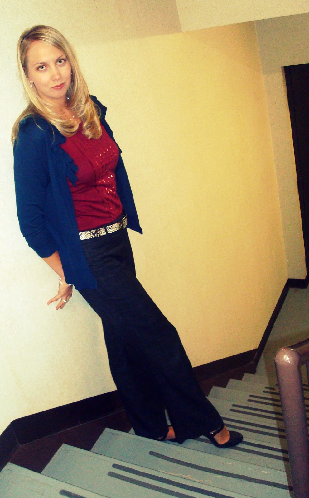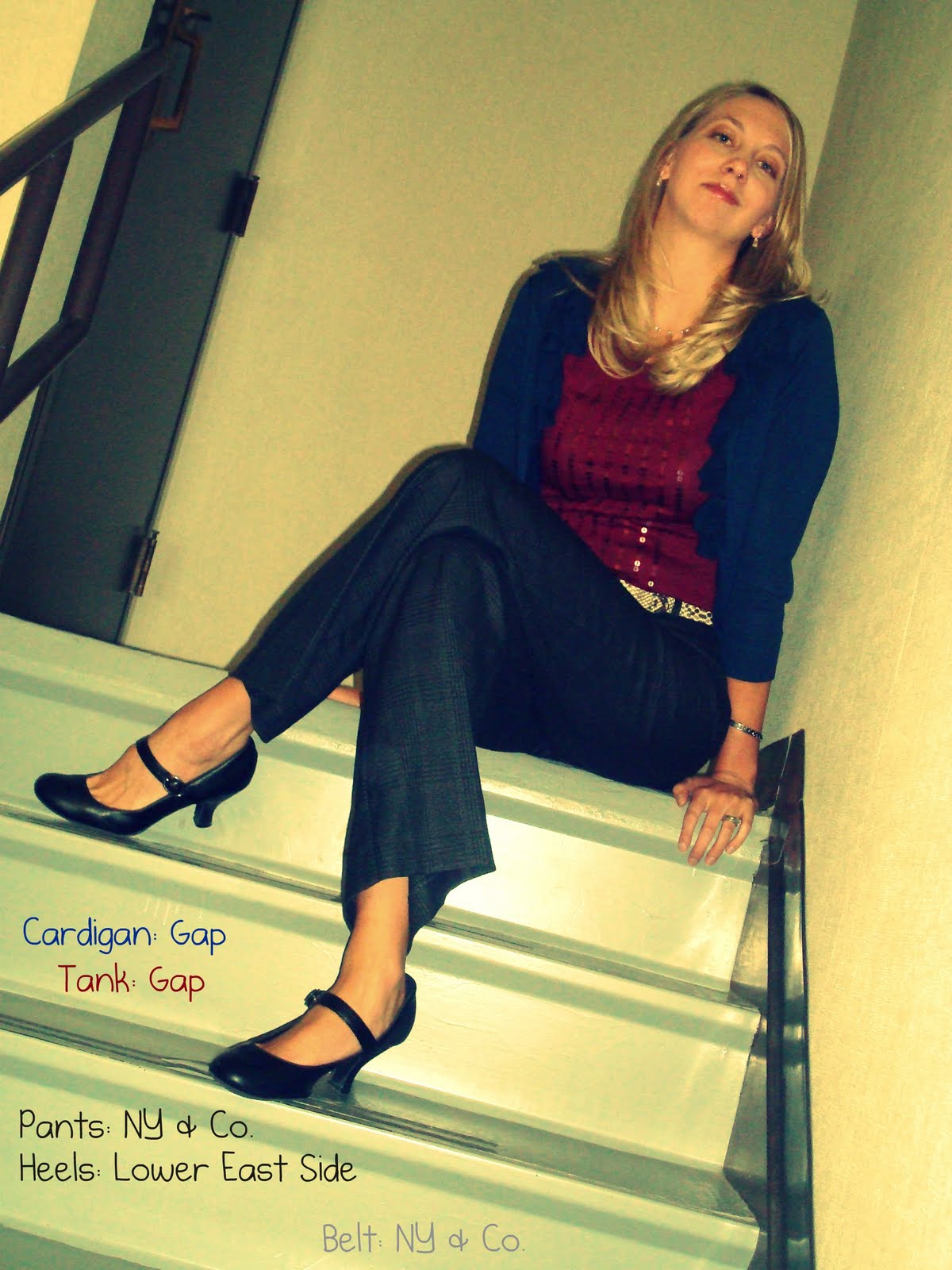 So, safety outfit it is - comfy pants, even comfier tank top and cardigan with a pair of basic black heels.